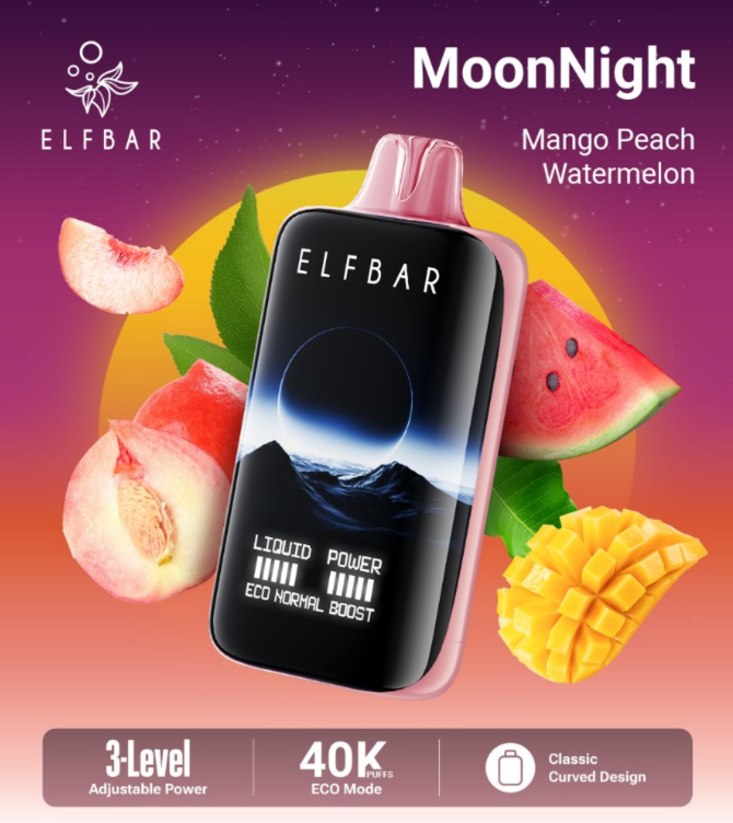 The Eflbar Moonnight 40K Mango Peach Watermelon is the perfect fruity blend for vapers who crave sweet, refreshing, and tropical flavors all day long.